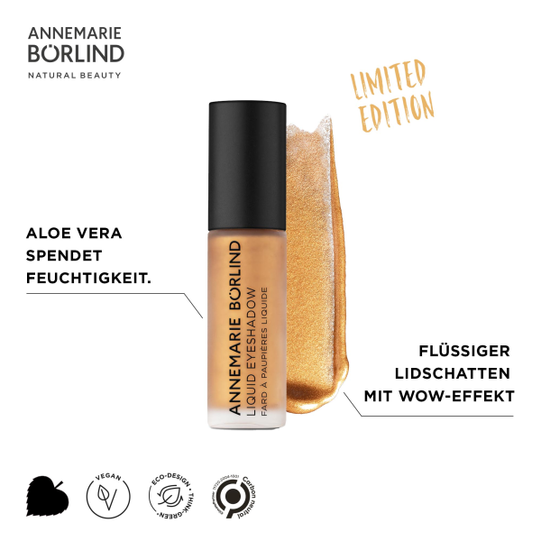 FLÜSSIGER LIDSCHATTEN Pflegender, flüssiger Lidschatten mit Wow-Effekt. Der LIQUID EYESHADOW GOLD bringt die Augen zum Leuchten. Die Geltextur mit metallisch reflektierenden Pigmenten lässt sich mühelos verblenden und trocknet schnell. Aloe Vera aus unserem sozial-ökologischen Projekt spendet der Augenpartie Feuchtigkeit. Mit natürlichen Inhaltsstoffen. Ohne Mineralölderivate und Mikroplastik. Vegan.