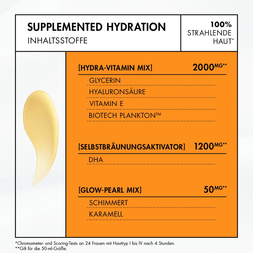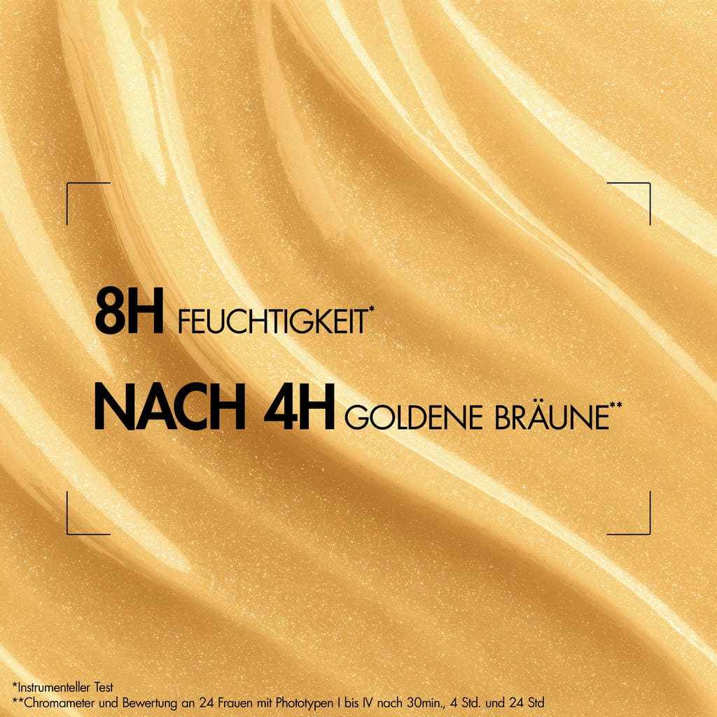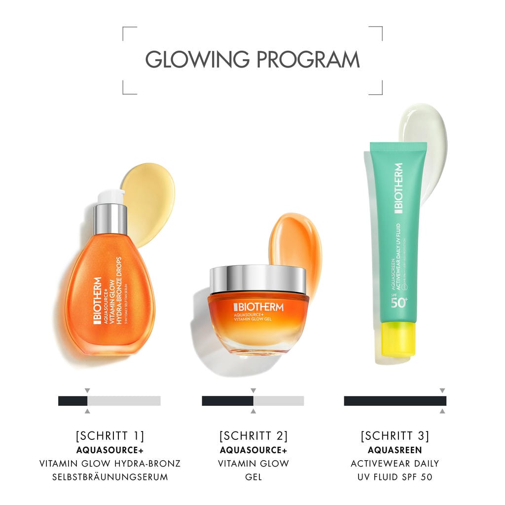 Die Aquasource+ Vitamin Glow Hydra-Bronze Drops verleihen sofortiges Strahlen, eine schrittweise, maßgeschneiderte Selbstbräunung, die bereits nach 4 Stunden sichtbar ist, und Feuchtigkeit, die 8 Stunden* anhält. Da 100 % der Frauen den erwarteten Bräunungseffekt und Hautglanz in nur 4 Stunden zeigten, ist das 3-in-1-Serum ein natürliches Bräunungs-Essential, um das Strahlen stets zu bewahren. Mit dem Hydra-Vitamin Mix, dem Self-Tan Activator und dem Hydra-Vitamin Mix, bietet es eine hautpflegebasierte Lösung, die ein ultimativ strahlendes Bronze-Finish verleiht. Eine Entscheidung zwischen Bronzer oder Selbstbräuner ist nicht notwendig; Die Aquasource+ Vitamin Glow Hydra-Bronze Drops sind eine maßgeschneiderte Lösung. Dieses 3-in-1-Serum verleiht ein sofortiges Strahlen, eine streifenfreie und schrittweise leichte Bräune, die sich Tag für Tag aufbaut, während es eine 8-stündige Feuchtigkeitsversorgung gewährleistet. Durch die Anpassung der Tropfenanzahl besteht die Möglichkeit, den gewünschten Look zu kreieren: von einem natürlichen und gesundaussehenden Glanz über einen sonnengeküssten Bronze-Effekt bis hin zu einem stärker gebräunten Aussehen im Gesicht, am Hals und am Dekolleté. Die Hydra-Bronze Drops sind geeignet für alle Hauttypen, selbst für empfindliche Haut.*Instrumenteller Test