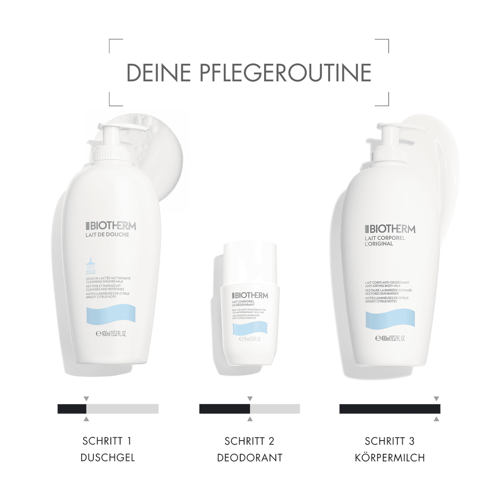 Biotherm Lait de Douche ist eine reinigende Dusch-Milch mit ultra-feuchtigkeitspendenden Wirkstoffen und ätherischen Zitrusölen. Die erste Dusch-Milch von BIOTHERM mit Zitrusessenzen. Die seifenfreie Milchtextur der Biotherm Lait de Douche Duschmilch mit ultra-feuchtigkeitspendenden Wirkstoffen, parfümiert, schützt und reinigt die Haut auf sanfte Weise.