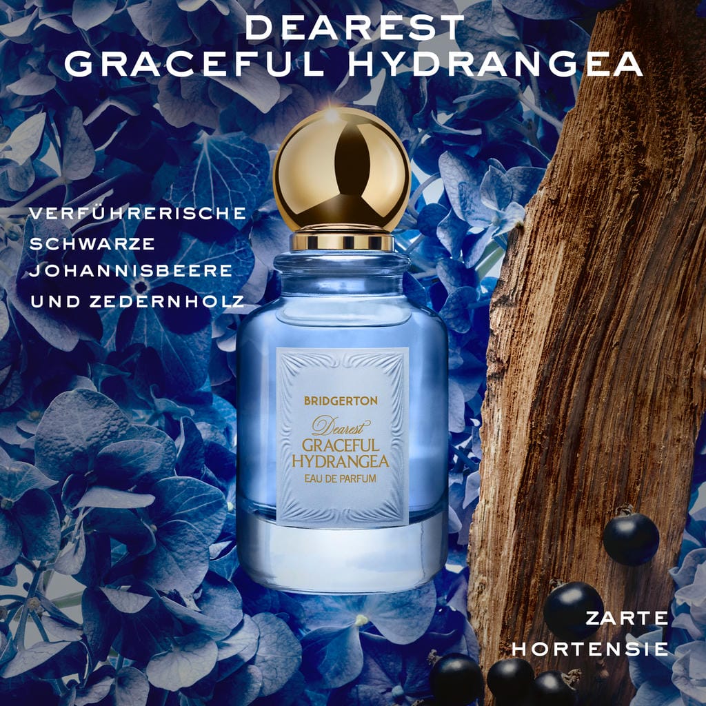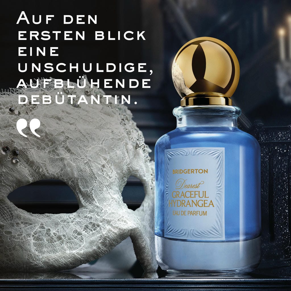 Meine hochverehrten, treusten Mitglieder der feinen Gesellschaft, die Duft-Saison hat Einzug gehalten! Entdeckt Dearest Graceful Hydrangea Eau de Parfum für Damen - die blumig-holzige Signatur der offiziellen Duft-Kollektion eurer liebsten Netflix-Serie: Bridgerton. Auf den ersten Blick wirkt sie wie eine unschuldige aufblühende Debütantin, bis verführerische schwarze Johannisbeere und sinnliches Zedernholz eine verborgene Tiefe wecken, die von einer cremigen Nougatnote abgerundet wird. Die Verpackung dieses Damen-Eau de Parfum ist mehr als ein Hauch von Regency-Ära-Flair, sie ist ein Liebeserklärung an die Raffinesse. Der von einer runden, goldenen Kappe gezierte Parfumflakon erinnert an die Apothekerfläschchen vergangener Zeiten. Barocke Damast-Ornamente verzieren das Etikett und die Verpackung im Bridgerton-Stil. Pastellige Blautöne sind so fesselnd wie eine florale Begegnung. Ein nobles Wappen erinnert an die Tradition der feinen Gesellschaft, während ein dezenter, symbolischer Akzent – eine Maske – auf Maskeraden und gesellschaftliche Intrigen anspielt. Wer wird euer Duft-Diamant der Saison? Bridgerton Eaux de Parfum: Limitierte Editionen. Meine hochverehrte Leserschaft, greift zu, bevor sie sich – wie so mancher Skandal – von dem gesellschaftlichen Parkett zurückziehen.