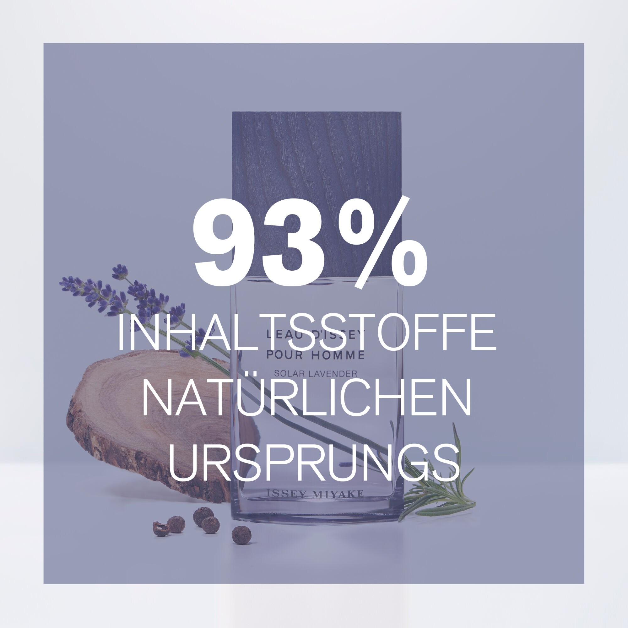 L'Eau d'Issey pour Homme Solar Lavender - das neue Eau de Toilette Intense Parfum für den Mann L'Eau d'Issey pour Homme Solar Lavender Eau de Toilette Intense ist das neue Parfum für den Mann von Issey Miyake. Geboren unter der Frühlingssonne, ist dieser maskuline Duft ein Erwachen der Kontraste, in dem Wasser auf Materie trifft, um eine moderne Interpretation von Lavendel zu schaffen.Ein würzig-holziger aromatischer Duft für Männer L'Eau d'Issey pour Homme Solar Lavender ist eine Hommage an die Natur und offenbart eine sonnige Begegnung zwischen Lavendel und aquatischen Noten. Sichuan-Pfeffer unterstreicht die aromatische Frische und die warmen Facetten des 100% natürlichen französischen Lavendels. In der Basisnote intensiviert ein Zedernholzakkord die Würze dieses holzig-aromatischen Parfums. Ein Parfum im Zeichen der Natur Der innovative Verschluss aus 100 % Holz wurde mit einem patentierten Design entwickelt und kommt ohne Plastik aus, um die Umweltbelastung zu reduzieren. Der Flakon besteht zu 20% aus recyceltem Glas. Die Schachtel besteht aus Material aus nachhaltig bewirtschafteten, FSCTM-zertifizierten Wäldern und anderen kontrollierten Quellen. L'Eau d'Issey pour Homme Solar Lavender ist ein vegan-zertifizierter Duft, der zu 93% aus natürlichen Inhaltsstoffen besteht.Ein von Lavendel inspirierter Parfumflakon Der Flakon und die Kartonage von L'Eau d'Issey pour Homme Solar Lavender sind innen und außen von Lavendel inspiriert und in ein helles, sonnenverwöhntes Lila getaucht. Der transparente Glasflakon spiegelt die Reinheit des Wassers wider, während der Verschluss aus 100% Holz die Dichte der Materie widerspiegelt.