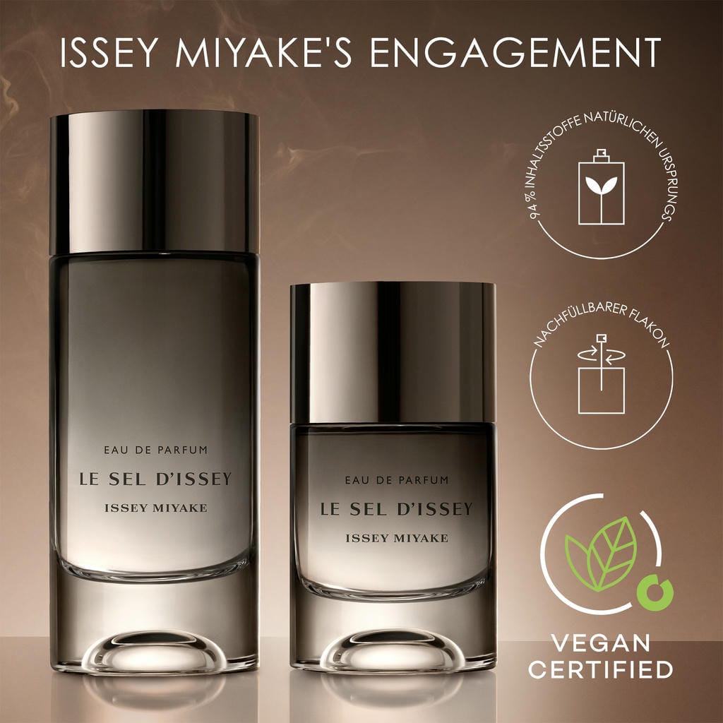 Le Sel d'Issey Eau de Parfum - das neue Herrenparfum mit einer warmen Intensität Le Sel d'Issey Eau de Parfum ist das neue intensive Parfum für Männer von Issey Miyake. Wenn die Natur mit Salz in Berührung kommt, wird sie belebt. Emotionen werden intensiviert, Erfahrungen werden verstärkt. Die Sinne werden beflügelt, denn Salz erweckt die Aromen zum Leben, und zwar mit noch mehr Intensität.Der holzig-maritime, herbe Amber-Herrenduft Dieser neue holzige, marine, herbe Amber-Duft wurde von Parfümeur Quentin Bisch kreiert und verbindet die Frische des Meeres mit der Lebendigkeit des Landes. Eine salzige Note, die an das Meer erinnert, kombiniert einen lebhaften Salzakkord mit natürlichem Meeresalgen und natürlichem Eichenmoos. Die erdige Komponente erinnert an das Land und wird durch die sinnlichen Noten von natürlichem Weihrauch und natürlichem Amber ergänzt. Upgecyceltes Zedernholz verstärkt die einhüllende Wärme.Ein lang anhaltender Duft, der die Intensität des Salzes mit maskuliner Eleganz verbindet.Le Sel d'Issey Eau de Parfum besteht zu 94% aus natürlichen Inhaltsstoffen, 100% französischem Alkohol natürlichen Ursprungs und ist vegan zertifiziert. Ein nachfüllbarer Parfümflakon mit markantem Design Der Designer Tokujin Yoshioka hat die reine und scharfe Ästhetik des Flakons von Le Sel d'Issey durch eine verstärkte Maskulinität intensiviert. Das zu 20 % recycelte Glas ist mit einem rauchgrauem Farbverlauf versehen und die Kappe in einem dunklen Metalton gehalten. Die Größen 50ml und 100ml sind mit einem 150ml Refill-Flakon nachfüllbar.Die Umverpackung aus mattgrauem, strukturierten Karton zeigt sich in perfekter Harmonie mit seinen metallischen Details. Sie besteht zu 10 % aus upgecyceltem Seegras sowie aus Materialen gut bewirtschafteter, FSC™-zertifizierter Wälder und anderen kontrollierten Quellen.Le Sel d'Issey Eau de Parfum wird in Frankreich hergestellt.