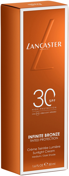 "Infinite Bronze ist der getönte Hybrid-Sonnenschutz von Lancaster. Infinite Bronze Tinted Protection Sunlight Cream LSF30 ist eine leichte und strahlende Foundation. Sie schenkt der Haut eine leichte Bräune und kaschiert sichtbare Unregelmäßigkeiten. Die Full-Light-Technologie schützt über UVB- & UVA-Strahlen hinaus, vor sichtbarem Licht- und Infrarotstrahlen, während Hyaluronsäure die Haut intensiv mit Feuchtigkeit versorgt. Die Haut erhält einen langanhaltenden, makellosen, natürlichen Glow."