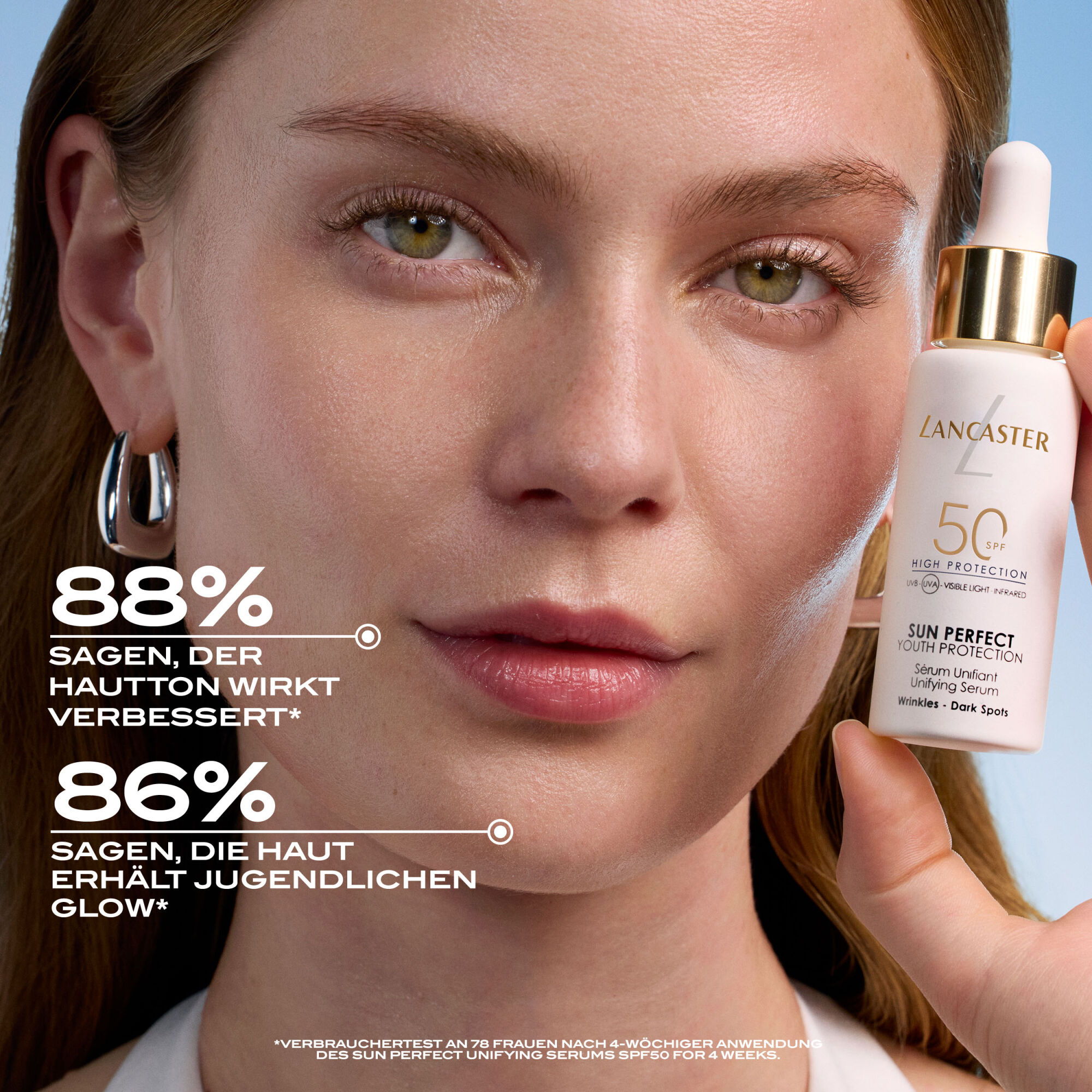 "Das neue Sun Perfect Unifying Serum SPF50 von Lancaster, das sichtbaren, durch lichtbedingte Alterung verursachten Alterungsanzeichen entgegenwirkt, ist ein kraftvolles Konzentrat, das Ultra-Breitband-Sonnenschutz mit Anti-Aging- und Repair-Wirkung bietet. Dieser Schutz vor lichtbedingter Hautalterung für jeden Tag von Lancaster, der Nr. 1 Prestige-Sonnenpflegemarke in Europa1, fördert ebenmäßige, perfektionierte, jünger aussehende Haut. Die Einwirkung von Sonnenlicht ist für 80 % der sichtbaren Alterungsanzeichen2 verantwortlich, ein Prozess, der als lichtbedingte Hautalterung bekannt ist. Da UVA- und UVB-Strahlen nur 10 % des Sonnenspektrums ausmachen, geht unsere Formulierung über herkömmlichen Sonnenschutz hinaus und schützt vor sichtbaren Licht- und Infrarotstrahlen. Unsere Full-Light TechnologieTM bietet einen 10-mal umfassenderen Sonnenschutz*. 1Insgesamt, 5 europäische (FR, DE, UK, IT & ES) Prestigemärkte & -marken. In Wert & Einheiten, 2017 bis Juni 2024. Circana Group L.P/BeautyTrends®. 2Die Weltgesundheitsorganisation & Yale Medicine, Studie zu lichtbedingter Hautalterung."