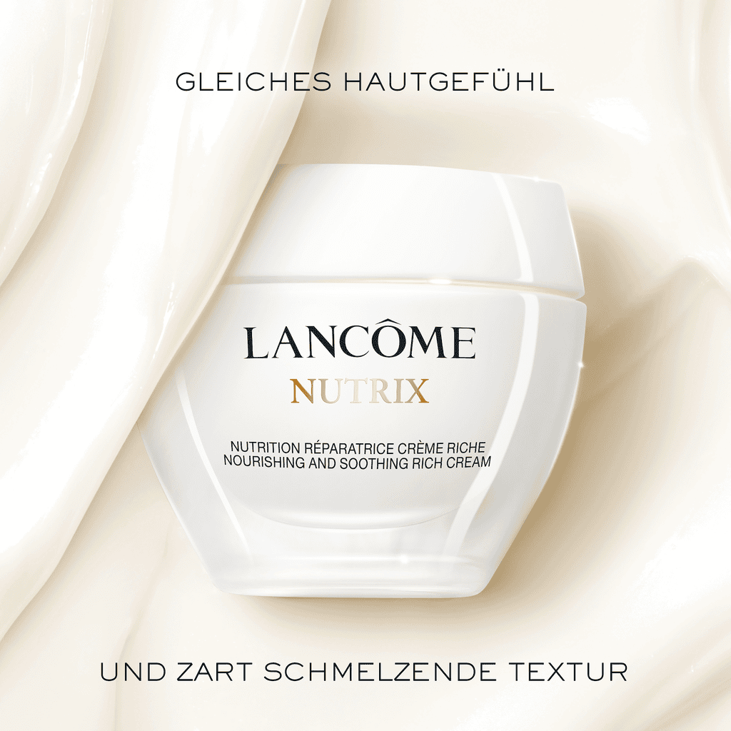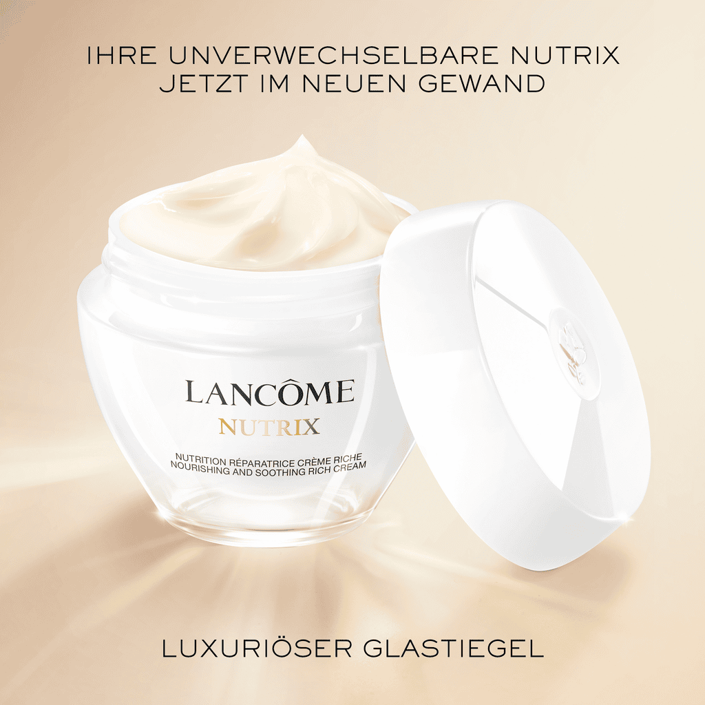 Die Lancôme Nutrix Gesichtscreme ist eine reichhaltige, nährstoffreiche und beruhigende Creme, die speziell für trockene, sehr trockene und empfindliche Haut entwickelt wurde. Jetzt im luxuriösen Glastiegel verfügbar. Sie spendet intensiv und langanhaltend Feuchtigkeit, lindert Spannungsgefühle, Irritationen sowie Empfindlichkeiten und stärkt die Hautbarriere. Die beruhigende, cremige Textur zieht schnell in die Haut ein, regeneriert sie, pflegt sie intensiv und hinterlässt ein Gefühl von Weichheit, Wohlbehagen und natürlicher Strahlkraft. •Dermatologisch getestete Formel, für trockene und empfindliche Haut geeignet •Nicht fettendes Finish mit einer reichhaltigen Textur, die schnell einzieht •Unverzichtbare tägliche Hautpflege für die Anwendung am Morgen und am Abend