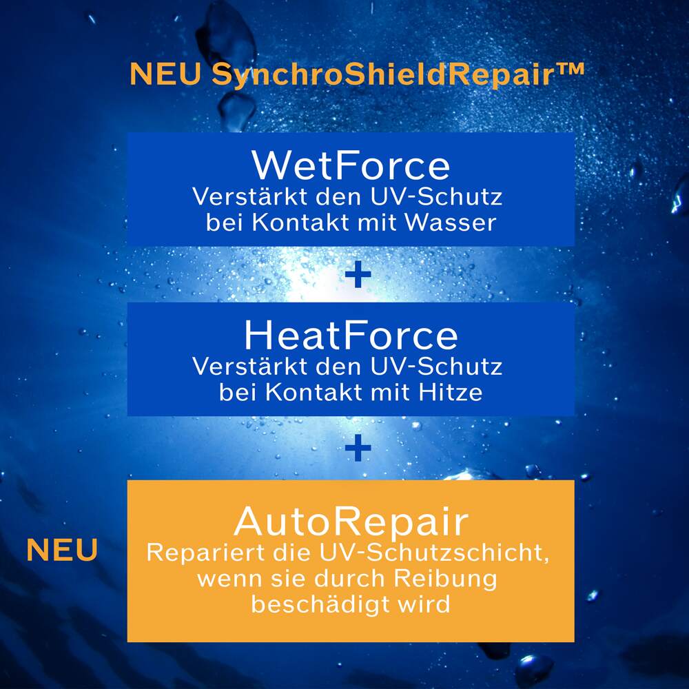 Die erste Sonnenschutzcreme von Shiseido, deren Schutzfilm durch Hitze und Wasser verstärkt wird und sich bei Abreibungen dank der von Shiseido patentierten SynchroShieldRepair™ Technologie automatisch selbst repariert.