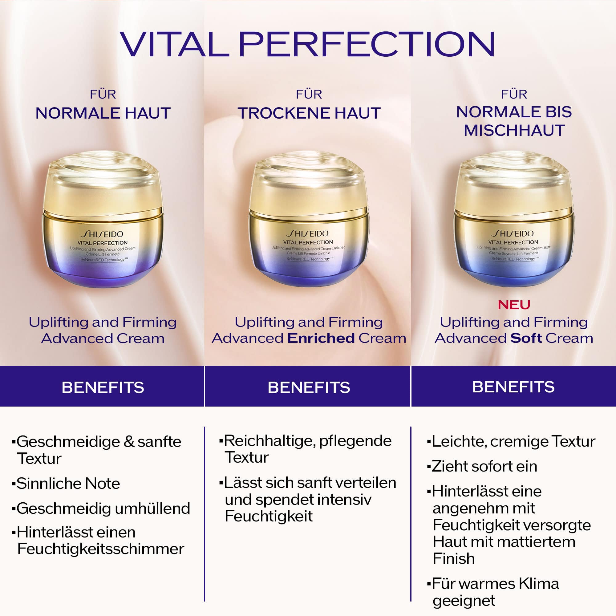 Entdecken Sie die Anti-Aging-Lösung von Shiseido, die der Haut in nur einer Woche ein um 40 % geliftetes, strafferes und ebenmäßigeres Aussehen verleiht* Die Uplifting and Firming Advanced Cream mit japanischem Know-how in der Neurowissenschaft ist jetzt in einer neuen, leichten Textur erhältlich, die nachfüllbar ist. ENTDECKEN SIE DIE NEUE EXKLUSIVE FORMEL VON SHISEIDO -Patentiertes SafflowerRED: Die fortschrittliche Forschung von Shiseido hat einen patentierten Inhaltsstoff entwickelt, der die Selbstregeneration* der Haut aktiviert, indem er ihr den Nährstoff-Haushalt stärkt und sie dabei unterstützt, tiefe Falten und fahle Haut zu bekämpfen. Die japanischen Mogami-Blüten, die in der abgelegenen Landschaft von Yamagata in Japan angebaut werden, liefern hochwertige Extrakte, die für ihre besonderen Eigenschaften für die Haut bekannt sind. - Nachhaltige und sichtbare Ergebnisse werden durch die ReneuraRED Technology geliefert *In-vitro-Test VERBRAUCHER BESTÄTIGEN o 99% empfinden, dass sich die Festigkeit der Haut verbessert ** o 94% finden, dass die Haut geliftet aussieht ** o 100% finden, dass die Haut ebenmäßiger aussieht ** o 96% haben das Gefühl, dass die Creme sanft in die Haut einzieht und sie sofort glatt und angenehm macht *** * Selbsteinschätzung von 110 Personen. ** Verbrauchertest mit 110 freiwilligen Probanden. Prozentwert nach 8 Wochen *** Verbrauchertest mit 110 freiwilligen Probanden. Prozentwert unmittelbar nach der Anwendung. Für alle Hauttypen geeignet. Dermatologisch getestet. Nicht komedogen. EINZIGARTIGE TEXTUR & VERWÖHNENDER DUFT -Enthüllen Sie das Potenzial Ihrer Haut mit der Uplifting & Firming Advanced Cream Soft, die feuchtigkeitsspendende und Anti-Aging-Wirkstoffe in einer einzigartigen und leichten Textur kombiniert. Duft: Entdecken Sie den edlen und eleganten Duft der japanischen Edelorchidee und schenken Sie Ihrer Haut ein zeitloses Shiseido-Erlebnis, um das Potential ihrer Haut zu verbessern. VITAL PERFECTION: #1 GESICHTSPFLEGE LINIE* Vital Perfection ist die Nr. 1* Linie von Shiseido für Frauen ab 45 Jahren, die hochwirksame Anti-Aging-Effekte bietet und durch einen neurowissenschaftlichen Ansatz unterstützt werden. Tiefe Falten und lichtbedingte Pigmentflecken werden bekämpft. - Entfachen Sie Ihr inneres Potential dank hoch innovativer Formulierung und bringen Sie Ihre Haut zum Strahlen! EINE SKINCARE-ROUTINE, UM INNERES POTENTIAL ZU ENTFACHEN 1. Vital Perfection LiftDefine Radiance Serum 2. Uplifting and Firming Eye Cream 3. Uplifting and Firming Advanced Cream JETZT AUCH ALS REFILL ERHÄLTLICH! Bei Verwendung der Nachfüllpackung wird der Plastikmüll um bis zu 79%** reduziert. *Quelle: Circana Group / Germany Prestige Beauty Gesichtspflege Marken / Umsatz in € / Jan-Nov 2024 **im Vergleich zur Vorgängerversion