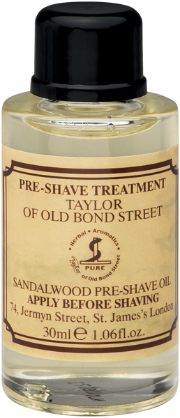Taylor of Old Bond Street Pre Shave Oil Sandelholz, 30 ml Vor der Rasur sanft in das Barthaar und in die Haut einmassieren, das Öl bildet eine Gleitschicht auf der Haut, die Klinge gleitet über die Haut ohne zu verkleben, klassischer betörender Fougère Duft mit blumigen Kopfnoten aus Geranie, Lavendel und Rosmarin. Made in GB